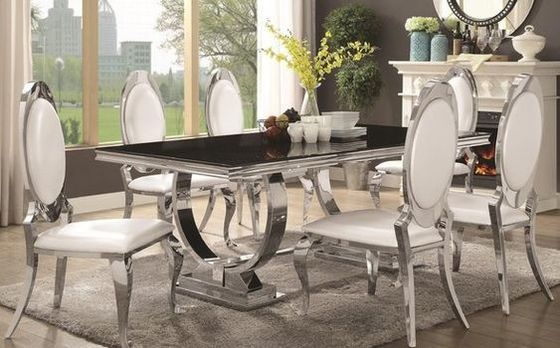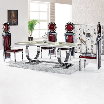 Il tavolo da pranzo è pricipalmente di progettazione semplice, adatto ad acquisto nella casa. Lo stile semplice è durevole, non il colore del fiore, ma l'argento classico di acciaio inossidabile come il colore principale. Il ripiano del tavolo può scegliere di usare il marmo o il pannello del MDF. Questo stile è stato acquistato sempre in grande quantità dai commercianti importanti della mobilia.