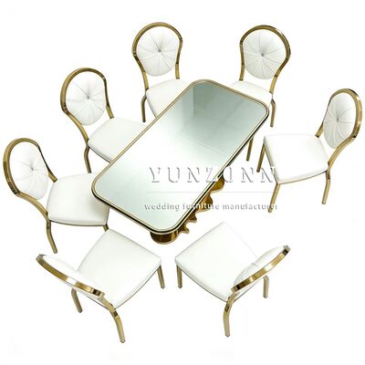 Q3: Qual è il materiale dei tuoi prodotti? A3: Telaio in acciaio inossidabile per tavolo e sedia, vetro temperato sul tavolo; marmo o legno. I cuscini delle sedie sono realizzati con spugne ad alta densità e pelle o tessuto di alta qualità.
