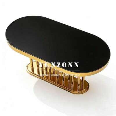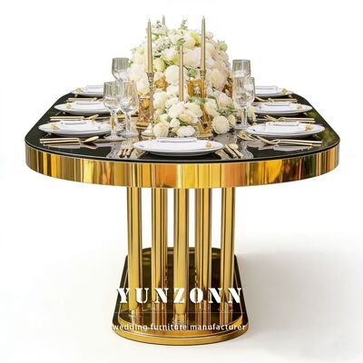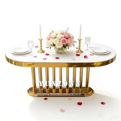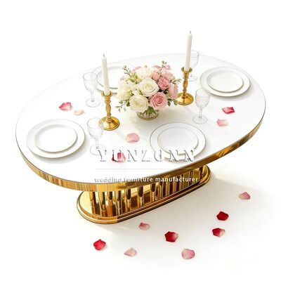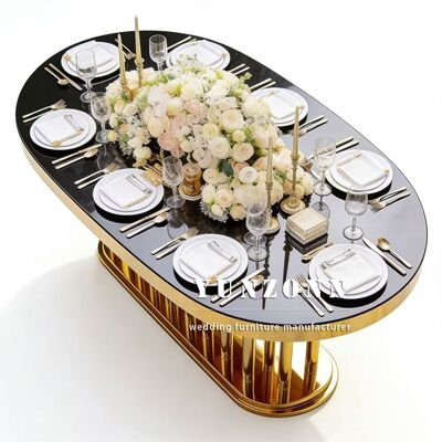 | Nome del prodotto: | Tavolo da pranzo lungo per hotel con piano in vetro a specchio bianco e telaio in acciaio inossidabile ovale dorato, all'ingrosso per matrimoni |