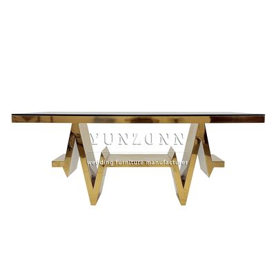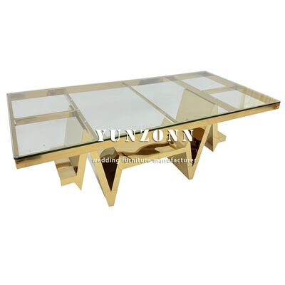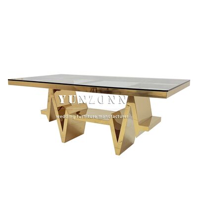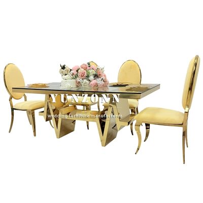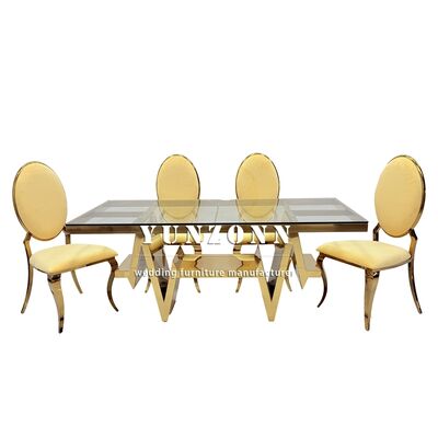 | Nome del prodotto: | Tavolo da pranzo in vetro in acciaio inossidabile dorato di lusso moderno per mobili da sposa all'ingrosso con 6 sedie |